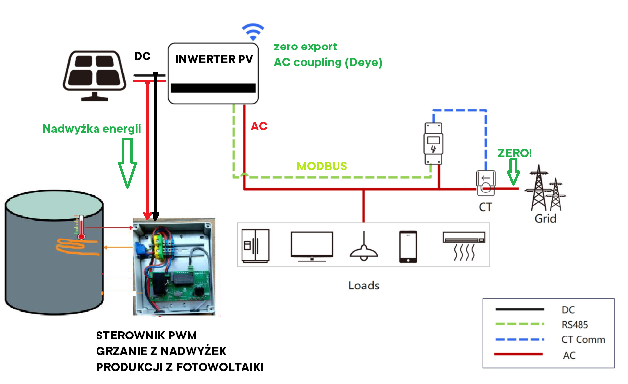 - każdą nadwyżkę energii nie zużytą przez falownik, router kieruje na grzałki i/lub SSR